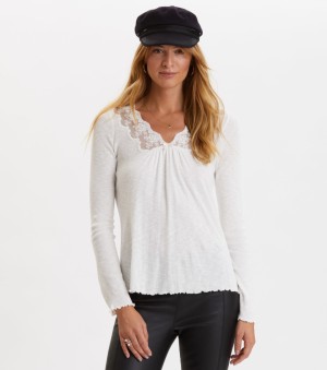 Női póló hosszú ujjakkal és enyhén V nyakkivágással, amelyet finom csipke szegélyez. Enyhén szűkített fazonnal. A kivarrt márka logó a bal alsó részen és a márkára jellemző lenyomat a bal ujján. Az organikus pamutból kötött anyag kellemesen puha és szellős, ráadásul az organikus pamut előállítása környezetkímélő. Sokoldalúan kombinálható, amely tökéletesen...fog mutatni szétgombolható kardigánnal és farmernadrággal kombinálva. A téli hónapokban alsó rétegként fogja kihasználni gyapjú kardigán alá. Ez a darab nem hiányozhat egy nő ruhatárából sem.tovább
