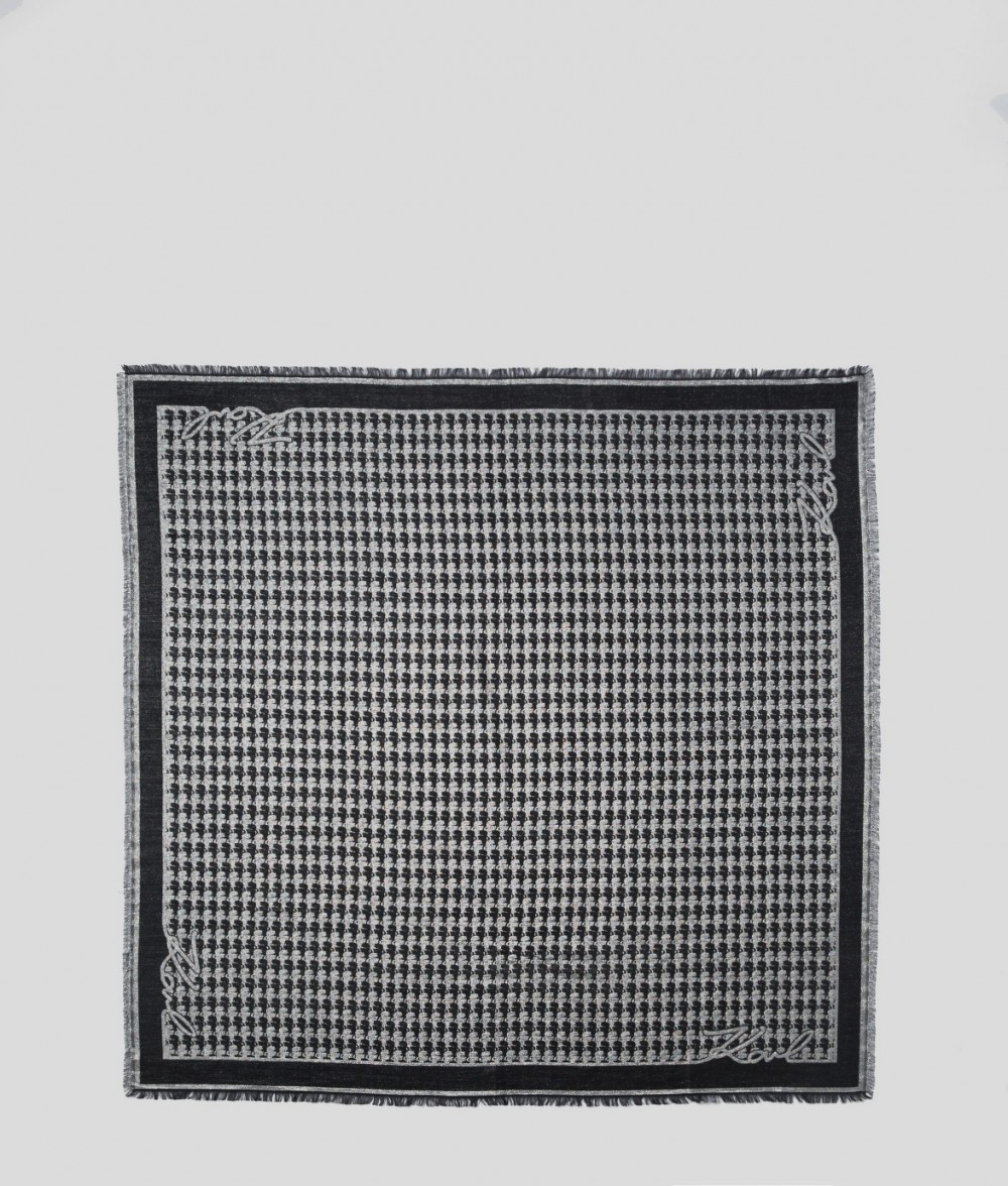 Luxus kendő selyem keverékből, K Cameo zsakard mintával, ikonikus aláírással szegélyezve. • Selyem és gyapjú keveréke • Méretek: 137 cm x 137 cm • KARL aláírás a peremén • KARL Cameo motívum a teljes felületén